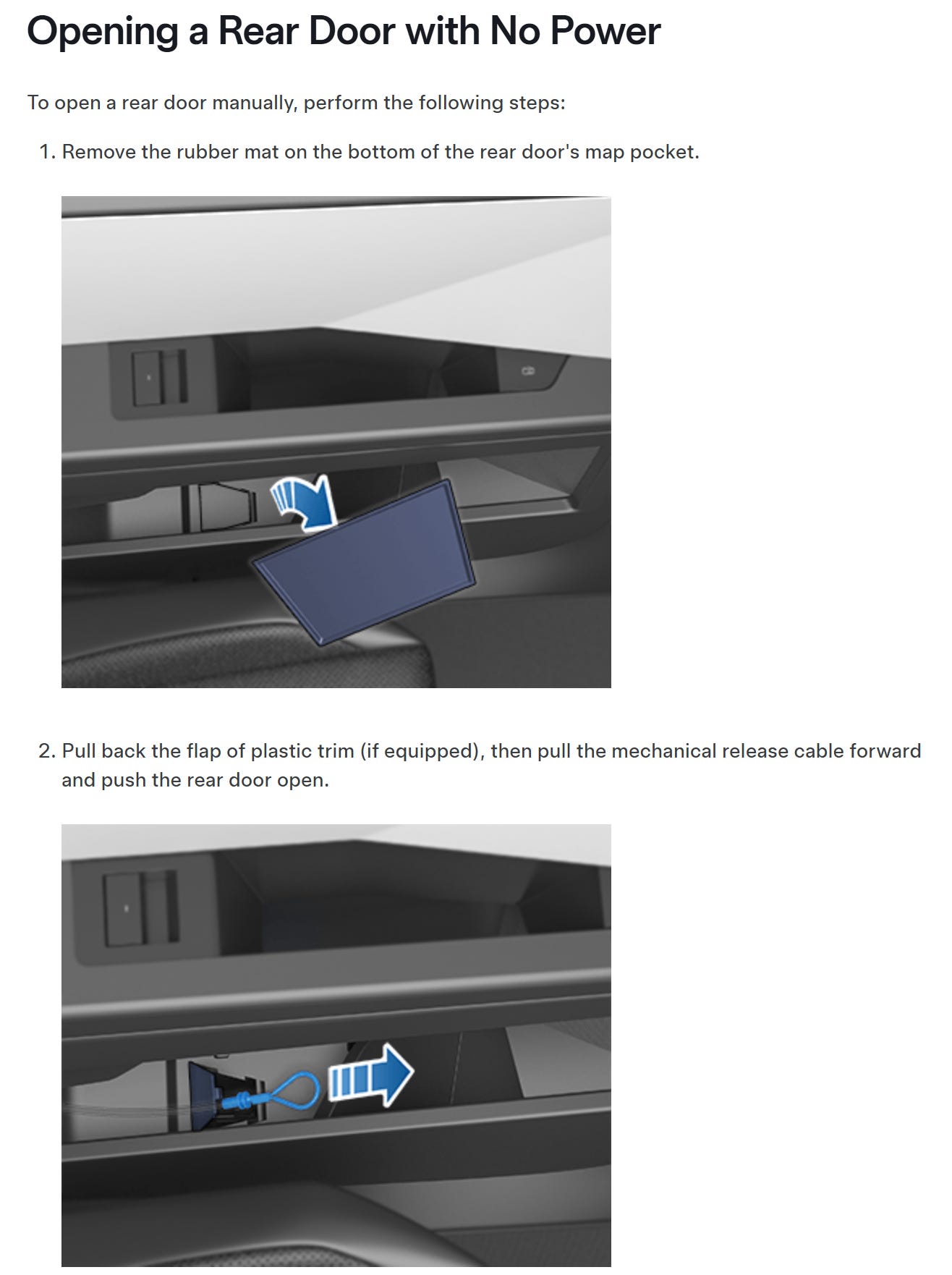 Model 3 rear door -- NOT EQUIPPED WITH MANUAL RELEASE (from manual: "Only the front doors are equipped with a manual door release")