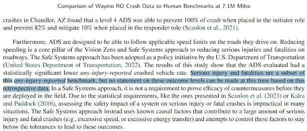 Below is a repost of a previous social media post on the difference between Waymo research results and what they over-claim in their public/government relations. And in particular why their PR claim of saving lives contradicts their actual research results. (This is new material to substack, so including it here for those who might have missed it. So consider this a 2-for-1 posting.)